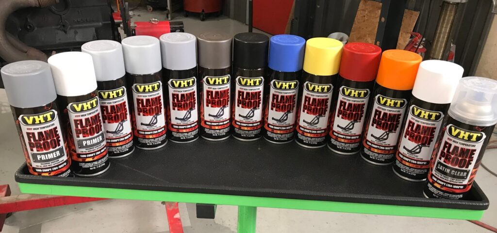 La pintura ignífuga insignia de VHT se desarrolló originalmente para el programa espacial para su uso en vehículos espaciales. Debido a su tolerancia al calor, VHT Flameproof pronto llegó a todos los rincones del mercado automotriz. VHT también ofrece otros productos para altas temperaturas para aplicaciones que van desde 121 °C a 482 °C: pintura para calipers, pintura para llantas, barra antivuelco y chasis.